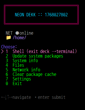 NEON DEKK transforms your standard terminal into a sleek, neon-styled menu. It simplifies everyday tasks, giving you one clean screen to launch tools, update your system, browse files, and check network status—no clutter, no confusing codes.